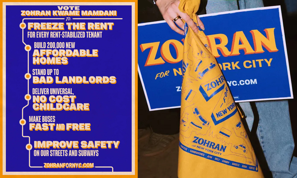 The Zohran Mamdani campaign has taken to the streets of New York city in an impossible-to-miss blaze of taxi-cab yellow, Mets blue, and fire-engine red. His branding challenges the status quo of political advertising with bold design elements inspired by NYC Metro iconography and hand-painted bodega storefront signage.